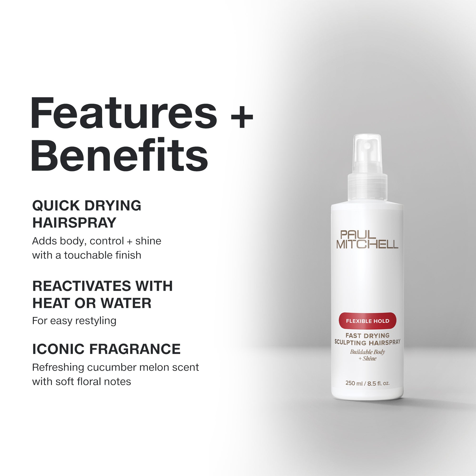 Ergänzen Sie jede Frisur mit flexiblem Halt durch das Paul Mitchell Fast Drying Sculpting Haarspray. Dieses schnell trocknende Haarspray liefert aufbaubaren Körper und Glanz mit einem berührbaren Finish. Es lässt sich mit Hitze oder Wasser reaktivieren, um ein einfaches Nachstylen zu ermöglichen.